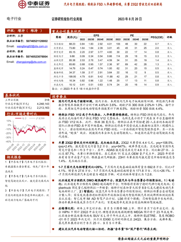 【中泰证券】【20230820】汽车电子周跟踪:特斯拉FSD入华趋势明确,禾赛23Q2营收交付双创新高-13页 行业研究