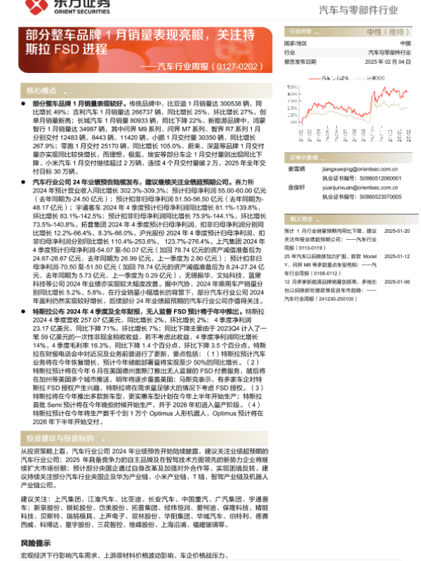 【东方证券】【20250204】20250204-东方证券-汽车行业周报:部分整车品牌1月销量表现亮眼,关注特斯拉FSD进程-20页 行业研究