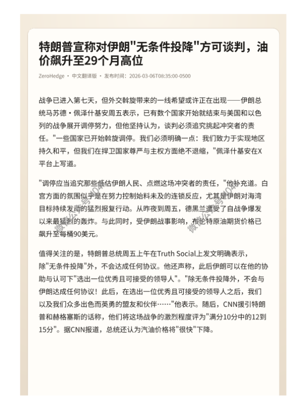 【ZeroHedge】【202603】特朗普宣称对伊朗"无条件投降"方可谈判,油价飙升至29个月高位-6页 证券期货研究报告