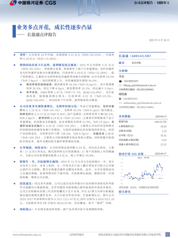 【银河证券】【20250418】长盈通(688143)点评报告:业务多点开花,成长性逐步凸显-10页 公司研究