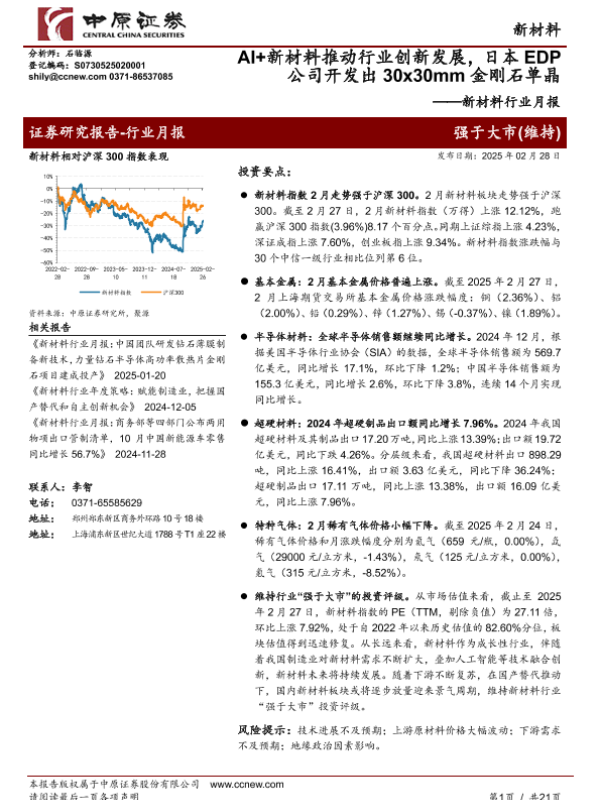 【中原证券】【20250228】2025年03月02日更新-【中原证券】新材料行业月报:AI+新材料推动行业创新发展,日本EDP公司开发出30x30mm金刚石单晶-21页 行业研究