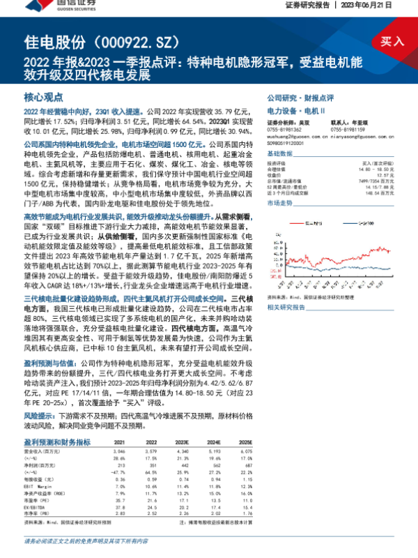 【国信证券】【20230621】佳电股份000922.SZ2022年报&2023一季报点评:特种电机隐形冠军,受益电机能效升级及四代核电发展-20页 行业研究
