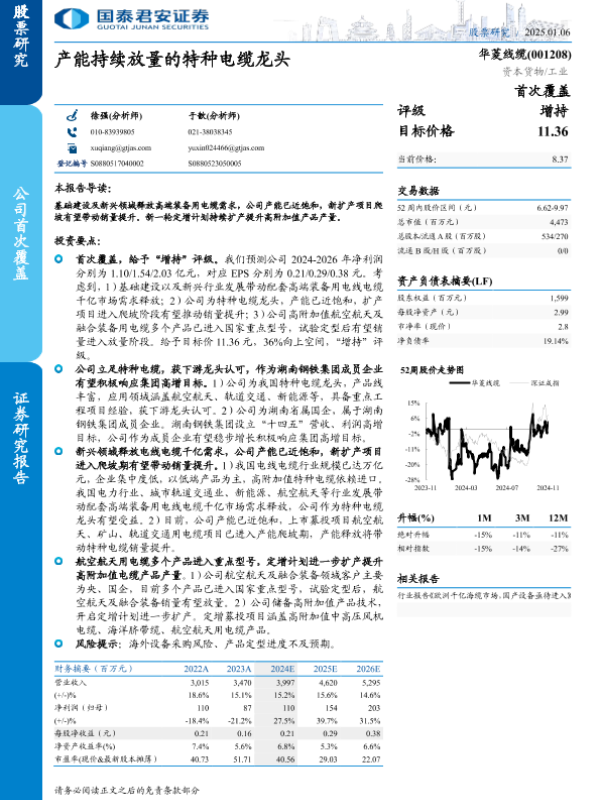 【国泰君安证券】【20250106】华菱线缆(001208)产能持续放量的特种电缆龙头-14页 行业研究