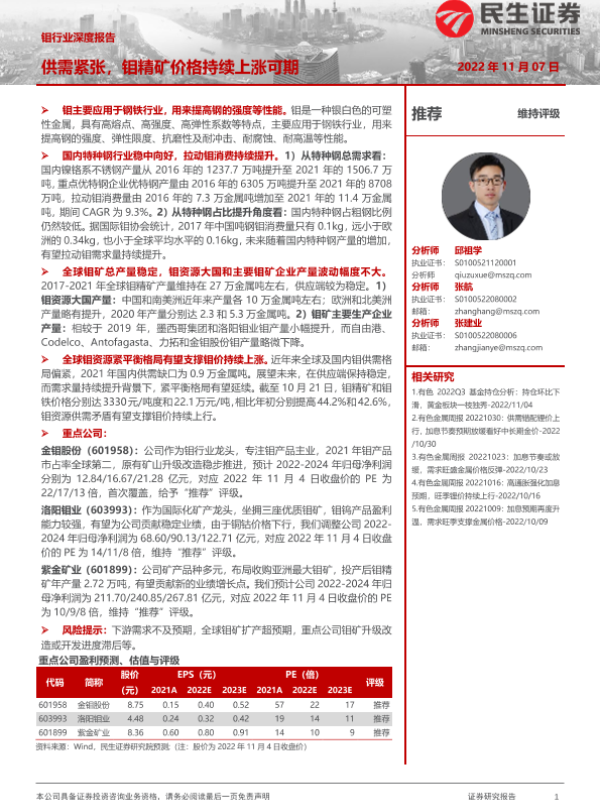 【民生证券】【20221107】20221107-民生证券-钼行业深度报告:供需紧张,钼精矿价格持续上涨可期-30页 行业研究