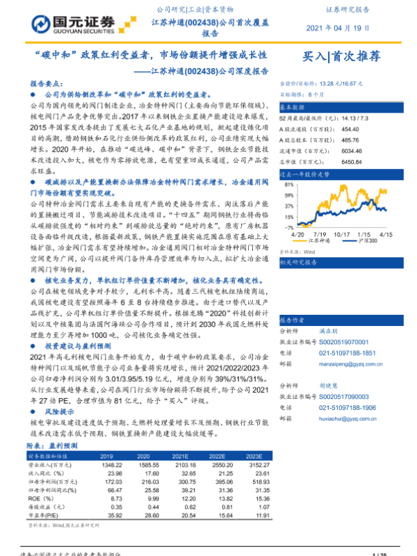 【国元证券】【20210419】“碳中和”政策红利受益者,市场份额提升增强成长性——江苏神通(002438)公司深度报告-25页 行业研究