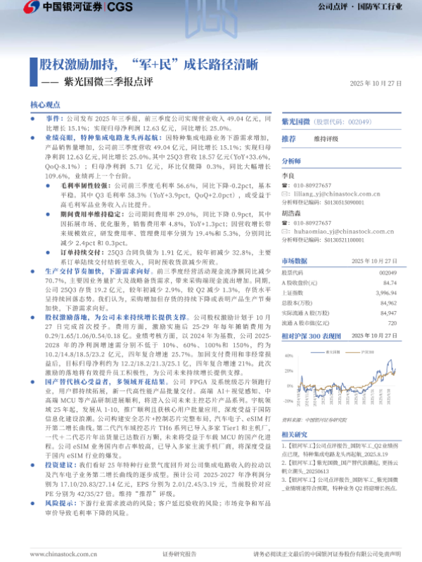 【银河证券】【202510】股权激励加持,“军+民”成长路径清晰——紫光国微三季报点评-4页 证券期货研究报告