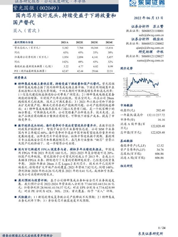 【东吴证券】【20220613】紫光国微-002049.SZ-国内芯片设计龙头,持续受益于下游放量和国产替代-24页 行业研究