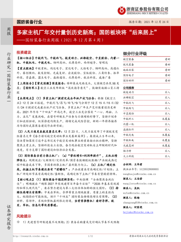 【浙商证券】【20211226】国防装备行业周报(2021年12月第4周):多家主机厂年交付量创历史新高;国防板块将“后来居上”-11页 行业研究