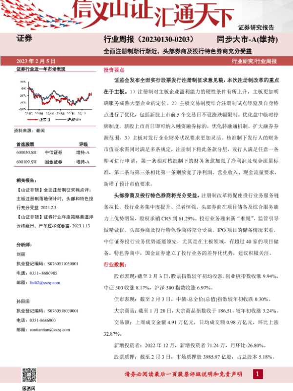 【山西证券】【20230205】证券行业周报:全面注册制渐行渐近,头部券商及投行特色券商充分受益-11页 行业研究
