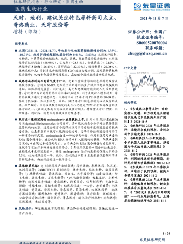 【东吴证券】【20211107】医药生物行业研究:天时、地利,建议关注特色原料药司太立、普洛药业、天宇股份等-24页 行业研究