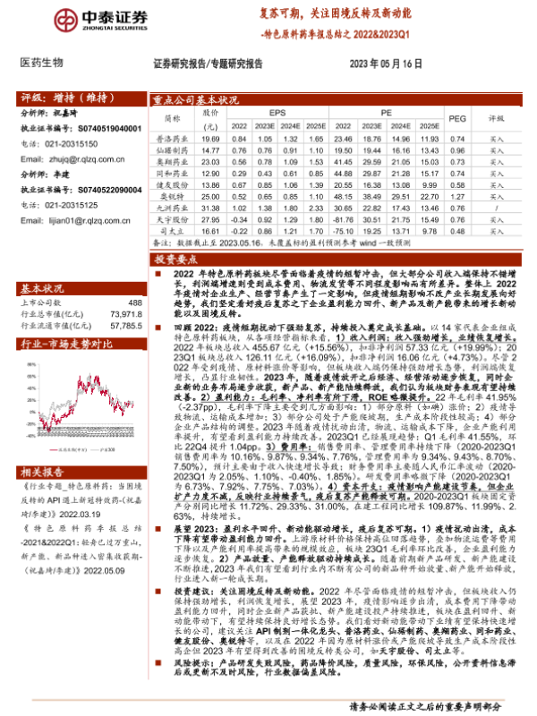 【中泰证券】【20230516】特色原料药季报总结之2022&2023Q1-复苏可期,关注困境反转及新动能-13页 行业研究