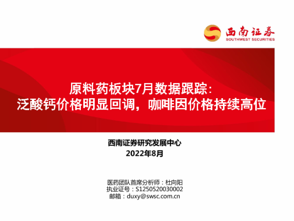 【西南证券】【202208】原料药板块7月数据跟踪:泛酸钙价格明显回调,咖啡因价格持续高位-29页 行业研究