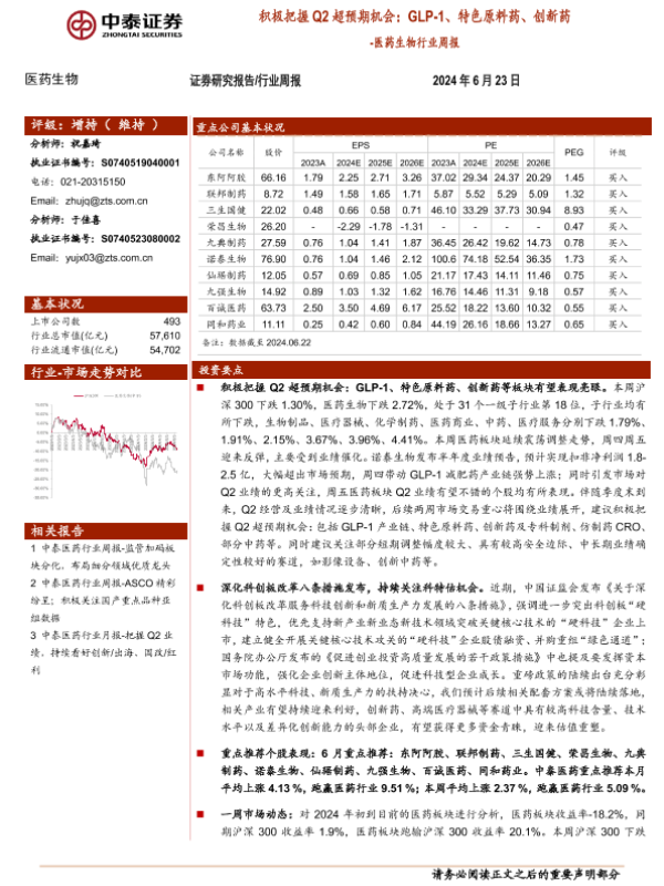 【中泰证券】【20240623】医药生物行业周报:积极把握Q2超预期机会-10页 行业研究
