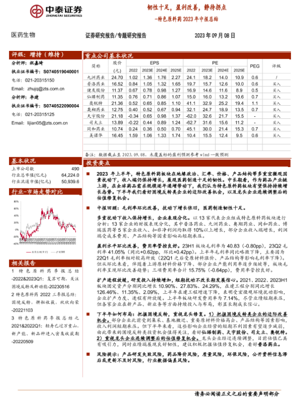 【中泰证券】【20230908】特色原料药2023年中报总结:韧性十足,盈利改善,静待拐点-11页 行业研究