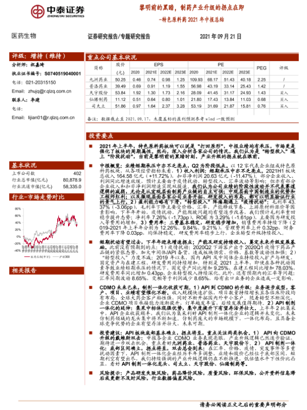 【中泰证券】【20210921】特色原料药2021年中报总结:黎明前的黑暗,制药产业升级的拐点在即-14页 行业研究