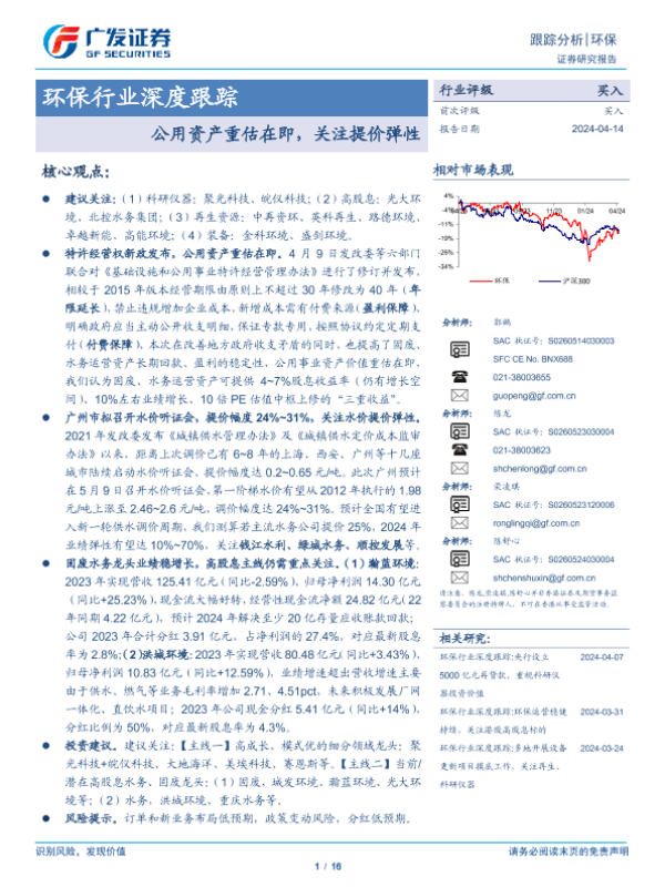 【广发证券】【20240414】环保行业深度跟踪:公用资产重估在即,关注提价弹性-16页 行业研究