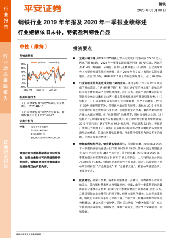 【平安证券】【20200508】钢铁行业2019年年报及2020年一季报业绩综述:行业短板依旧未补,特钢盈利韧性凸显-11页 行业研究