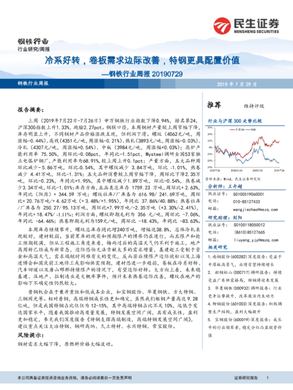 【民生证券】【20190729】20190729-民生证券-钢铁行业周报:冷系好转,卷板需求边际改善,特钢更具配置价值-29页 行业研究