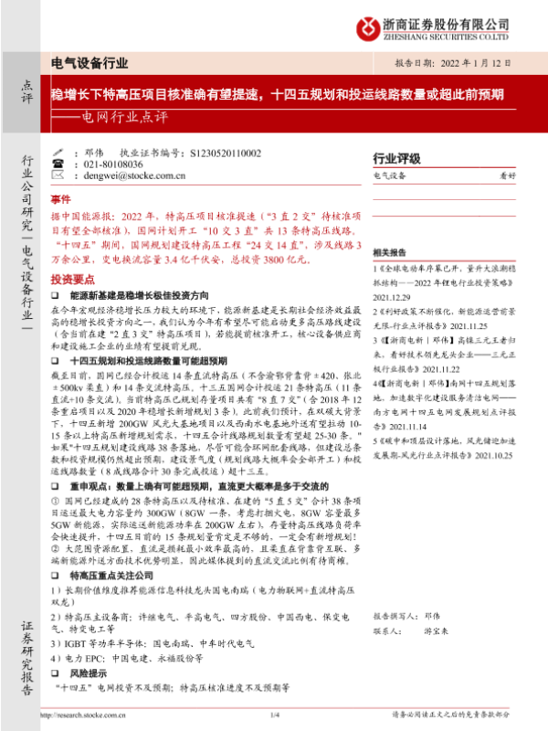 【浙商证券】【20220112】电网行业点评:稳增长下特高压项目核准备案有望提速,十四五规划和投运线路数量或超此前预期-4页 行业研究