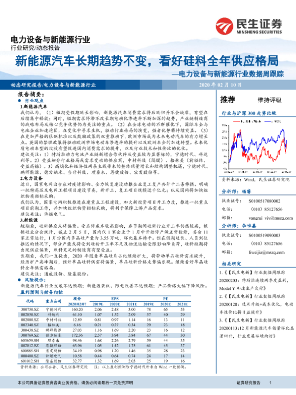 【民生证券】【20200210】电力设备与新能源行业数据周跟踪:新能源汽车长期趋势不变,看好硅料全年供应格局-16页 行业研究