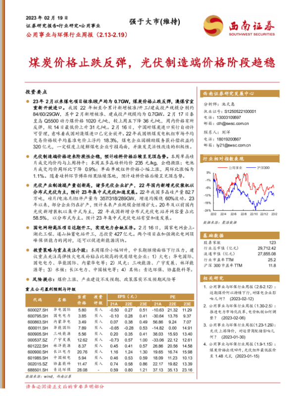 【西南证券】【20230219】公用事业与环保行业周报:煤炭价格止跌反弹,光伏制造端价格阶段趋稳-21页 行业研究