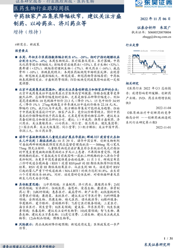 【东吴证券】【20221106】医药生物行业跟踪周报:中药独家产品集采降幅收窄,建议关注方盛制药、以岭药业、济川药业等-31页 行业研究