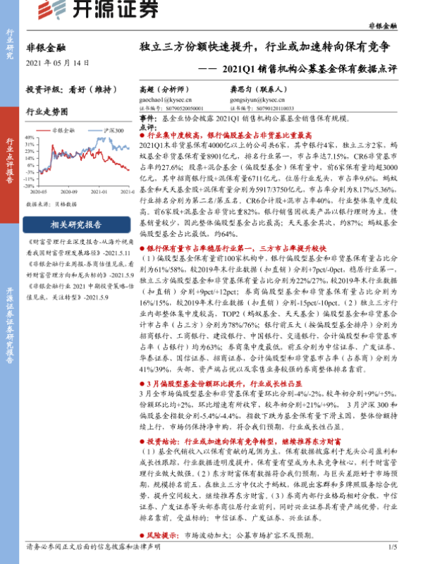 【开源证券】【20210514】2021Q1销售机构公募基金保有数据点评-独立三方份额快速提升,行业或加速转向保有竞争-5页 证券期货研究报告