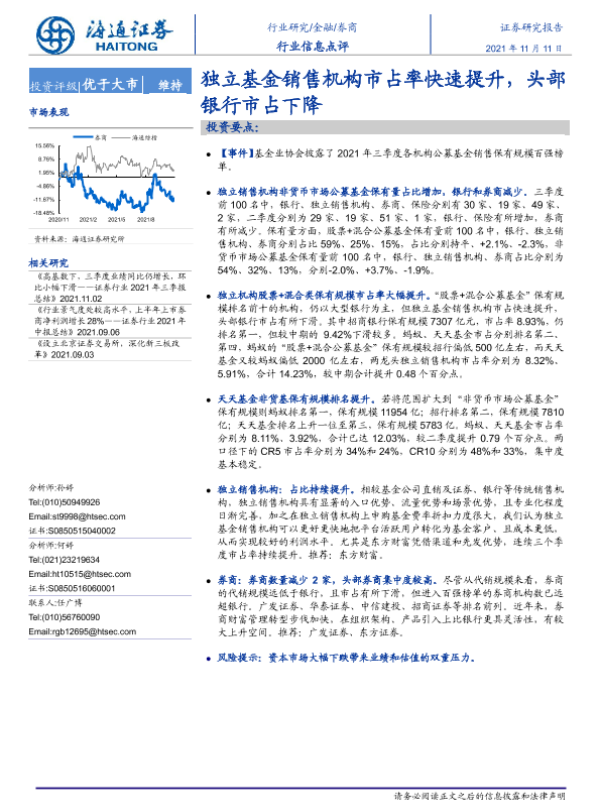 【海通证券】【20211111】金融券商行业信息点评:独立基金销售机构市占率快速提升,头部银行市占下降-3页 行业研究