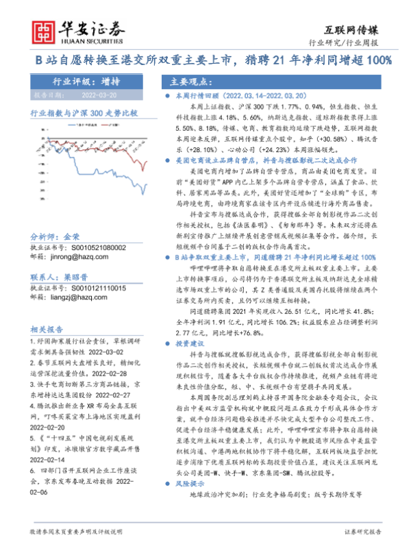 【华安证券】【20220320】互联网传媒行业周报:B站自愿转换至港交所双重主要上市,猎聘21年净利同增超100%-17页 行业研究