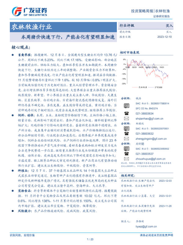 【广发证券】【20231210】20231210-广发证券-农林牧渔行业:本周猪价快速下行,产能去化有望明显加速-23页 行业研究