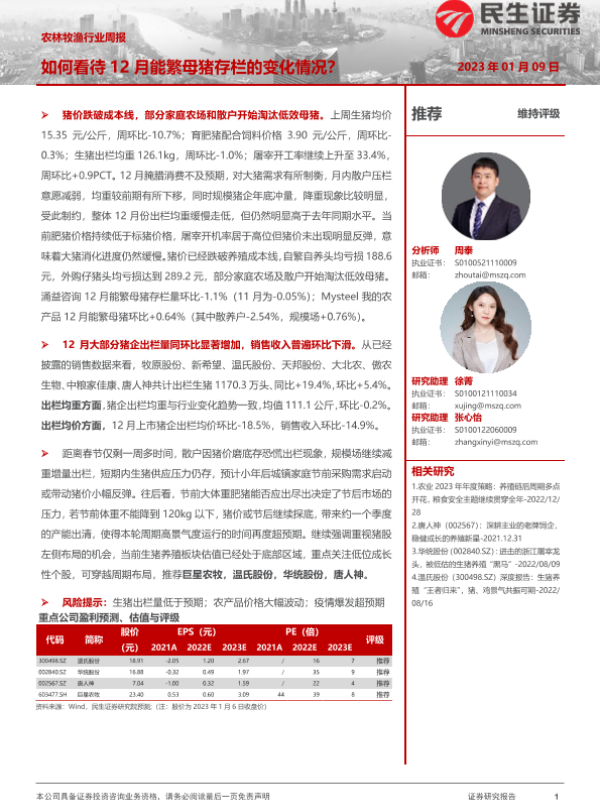 【民生证券】【20230109】20230109-民生证券-农林牧渔行业周报:如何看待12月能繁母猪存栏的变化情况?-15页 行业研究