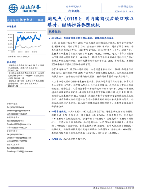 【海通证券】【20200119】20200119-海通证券-农业周观点:国内猪肉供应缺口难以填补,继续推荐养殖板块-4页 行业研究
