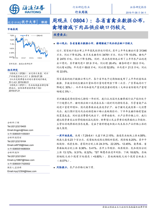 【海通证券】【20190804】20190804-海通证券-农业周观点:各省畜禽业数据公布,禽增猪减下肉品供应缺口仍较大-5页 行业研究