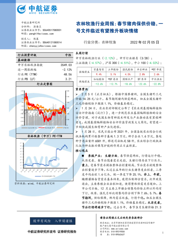 【中航证券】【20220205】20220205-中航证券-农林牧渔行业周报:春节猪肉保供价稳,一号文件临近有望推升板块情绪-11页 行业研究
