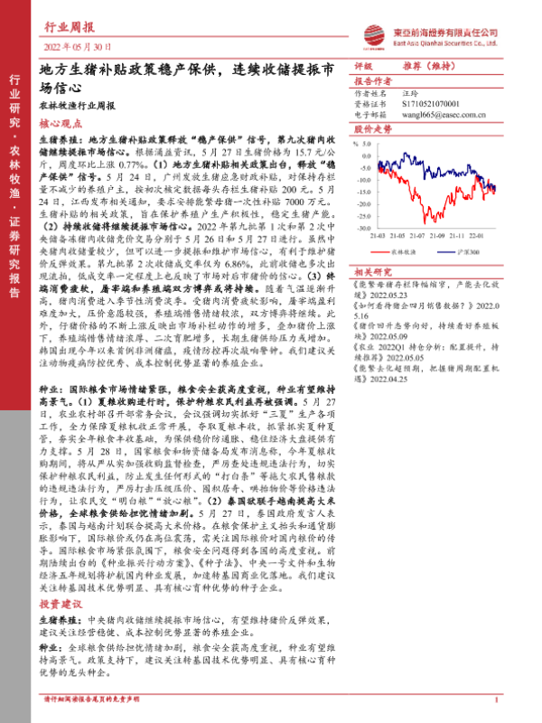 【东亚前海证券】【20220530】20220530-东亚前海证券-农林牧渔行业周报:地方生猪补贴政策稳产保供,连续收储提振市场信心-18页 行业研究