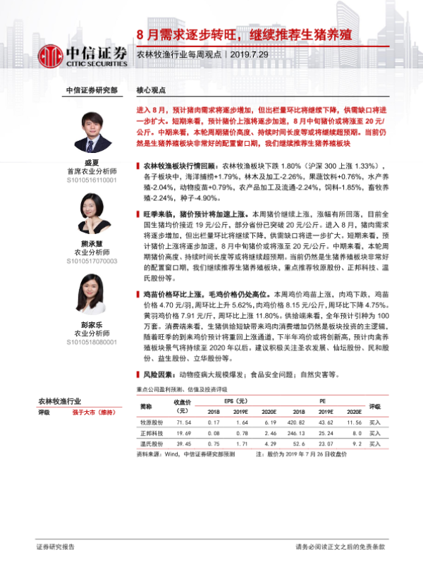 【中信证券】【20190729】20190729-中信证券-农林牧渔行业每周观点:8月需求逐步转旺,继续推荐生猪养殖-6页 行业研究