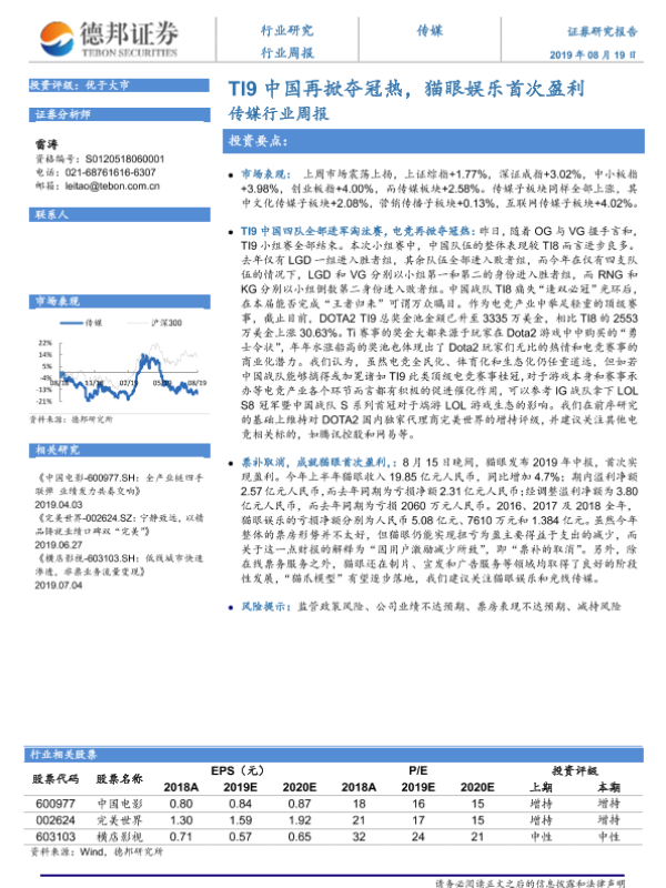 【德邦证券】【20190819】20190819-德邦证券-传媒行业周报:TI9中国再掀夺冠热,猫眼娱乐首次盈利-3页 行业研究
