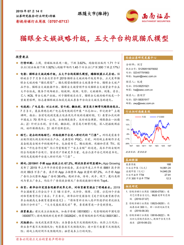 【西南证券】【20190714】影视传媒行业周报:猫眼全文娱战略升级,五大平台构筑猫爪模型-17页 行业研究