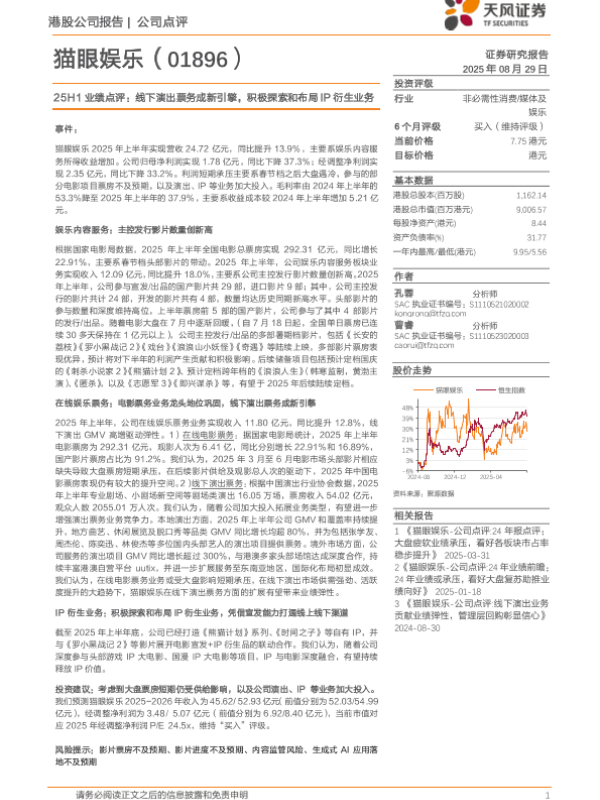 【天风证券】【20250829】猫眼娱乐-25H1业绩点评:线下演出票务成新引擎,积极探索和布局IP衍生业务-3页 证券期货研究报告