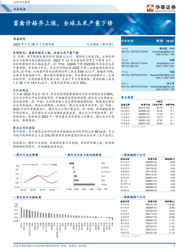 【华泰证券】【20230129】20230129-华泰证券-农林牧渔行业周报(第四周):畜禽价格齐上涨,全球玉米产量下修-20页 行业研究