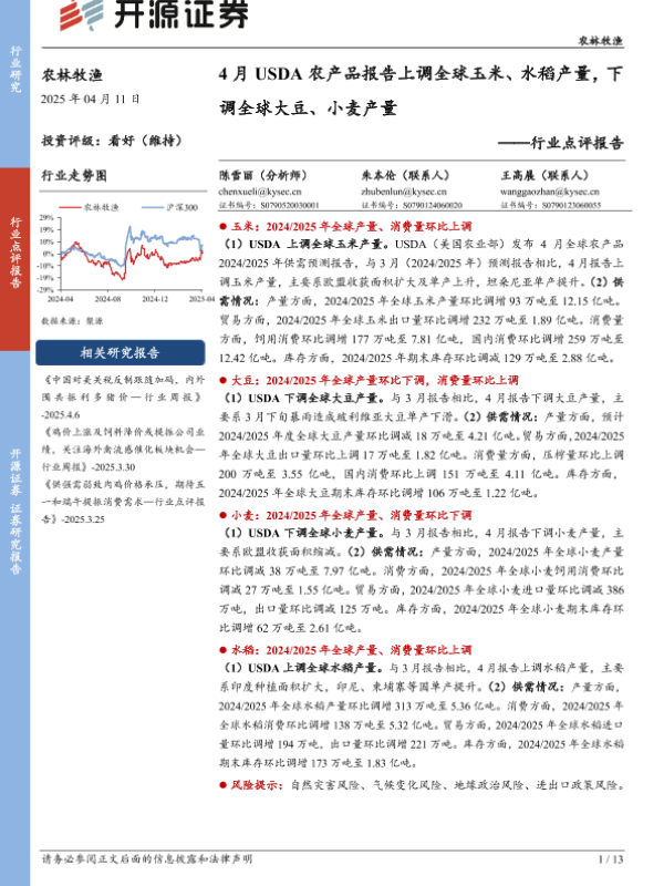 【开源证券】【20250411】4月USDA农产品报告上调全球玉米、水稻产量,下调全球大豆、小麦产量-13页 行业研究