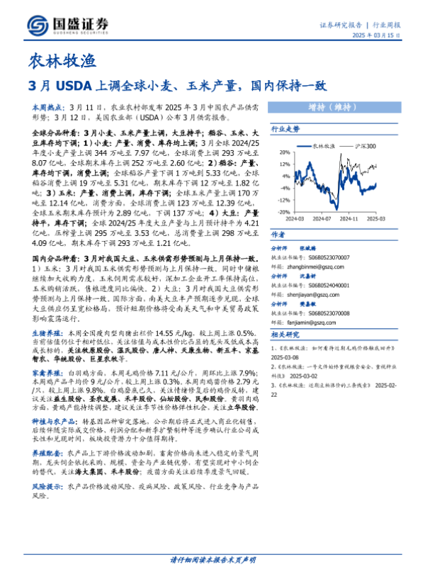 【国盛证券】【20250315】20250315-国盛证券-农林牧渔行业周报:3月USDA上调全球小麦、玉米产量,国内保持一致-12页 行业研究