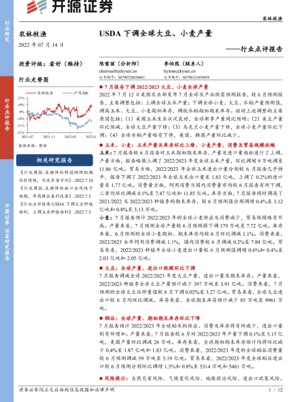 【开源证券】【20220714】USDA下调全球大豆、小麦产量-12页 证券期货研究报告