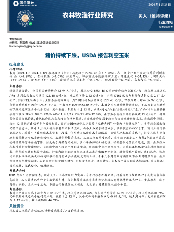 【国金证券】【20240114】20240114-国金证券-农林牧渔行业研究:猪价持续下跌,USDA报告利空玉米-14页 行业研究