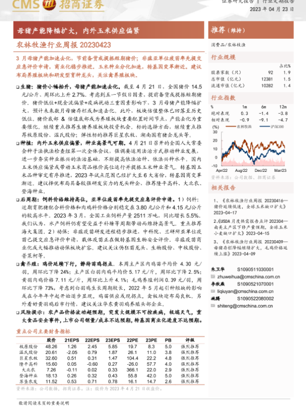 【海通证券】【20230423】农林牧渔行业周报:母猪产能降幅扩大,内外玉米供应偏紧-16页 行业研究