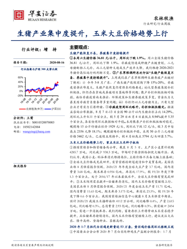 【华安证券】【20200816】20200816-华安证券-农林牧渔行业周报:生猪产业集中度提升,玉米大豆价格趋势上行-37页 行业研究