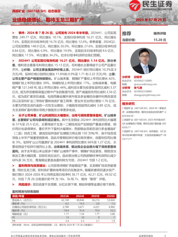 【民生证券】【20240728】西部矿业(601168)动态报告:业绩稳健增长,期待玉龙三期扩产-11页 行业研究