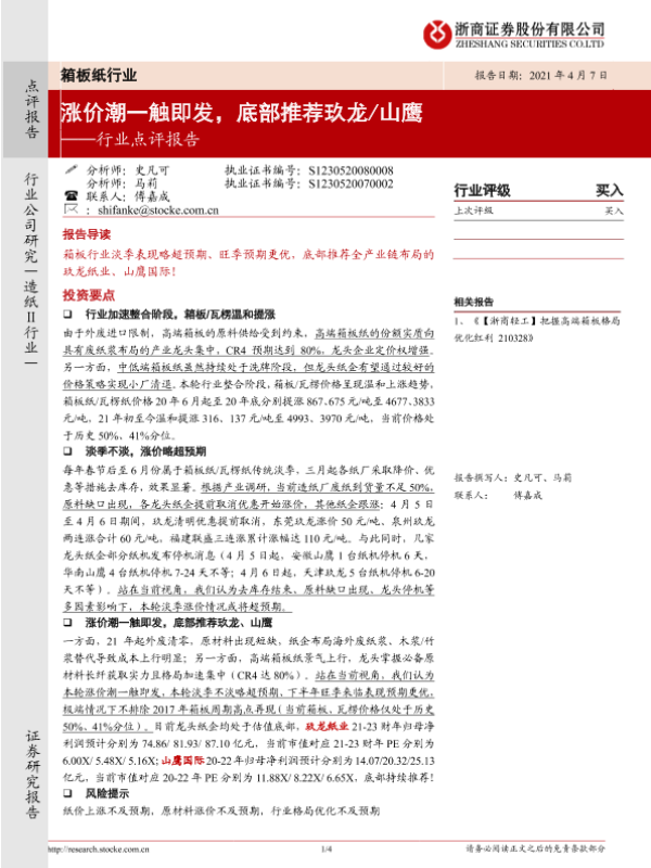 【浙商证券】【20210407】20210407-浙商证券-箱板纸行业点评报告:涨价潮一触即发,底部推荐玖龙 山鹰-4页 行业研究