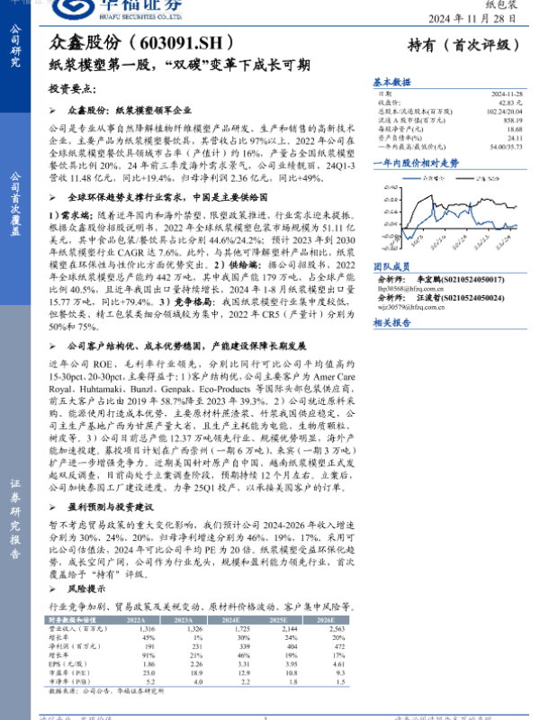 【华福证券】【20241128】众鑫股份:纸浆模塑第一股,“双碳”变革下成长可期-27页 行业研究