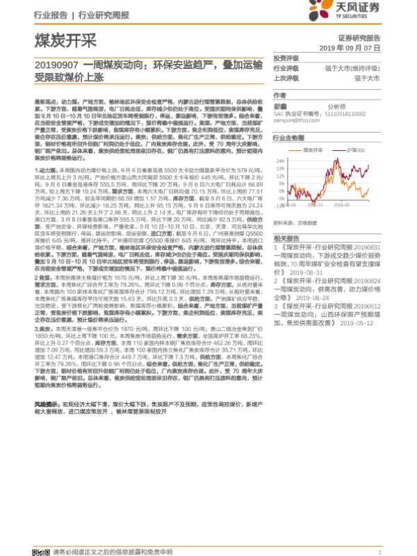 【天风证券】【20190907】20190907-天风证券-煤炭开采:一周煤炭动向:环保安监趋严,叠加运输受限致煤价上涨-19页 行业研究